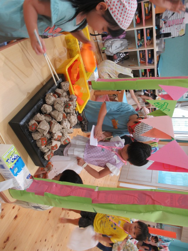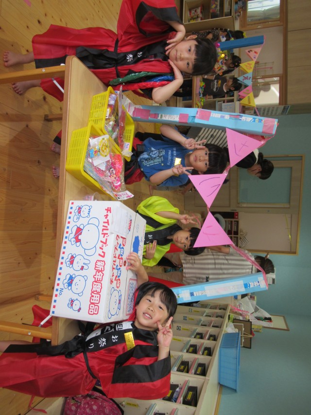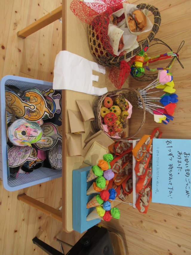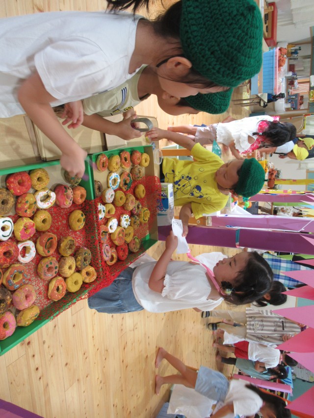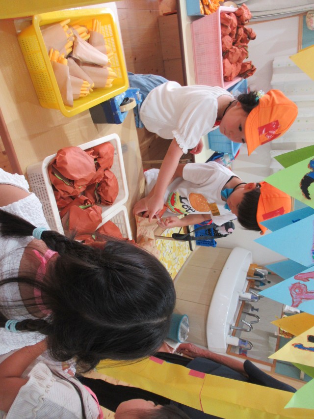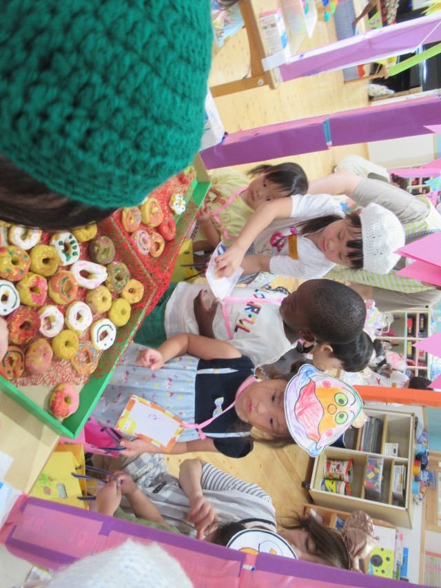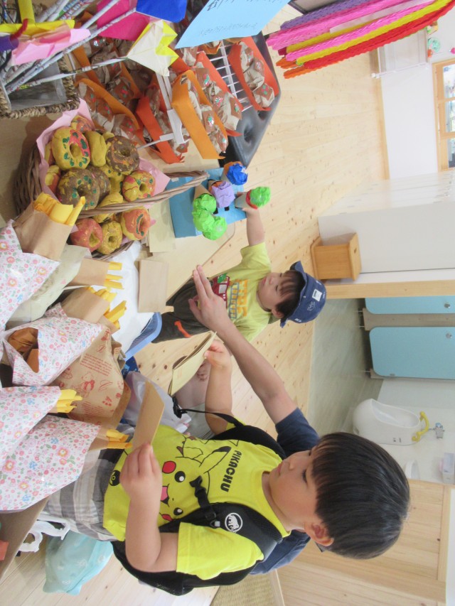 うめ組ともも組が一緒になって計画したお買い物ごっこをしました。ハンバーガーやアイスクリームにアクセサリーは子どもたちがみんなで制作しました。うめ組が店長でもも組がサブリーダー、お客さんは子どもたちでそれぞれお買い物を楽しみました。 | ||