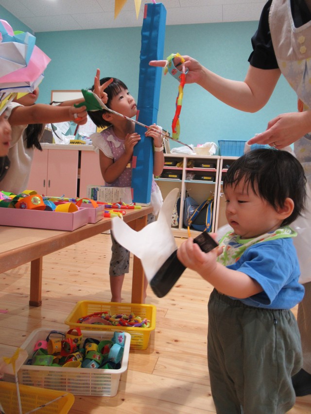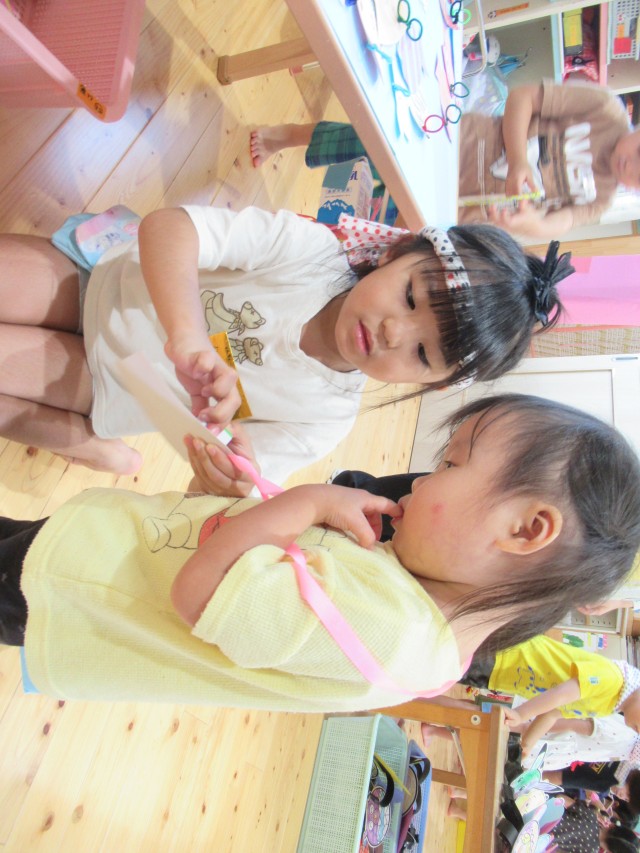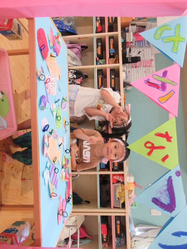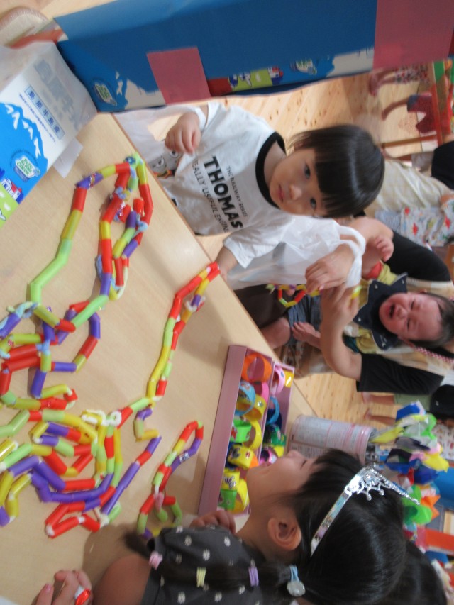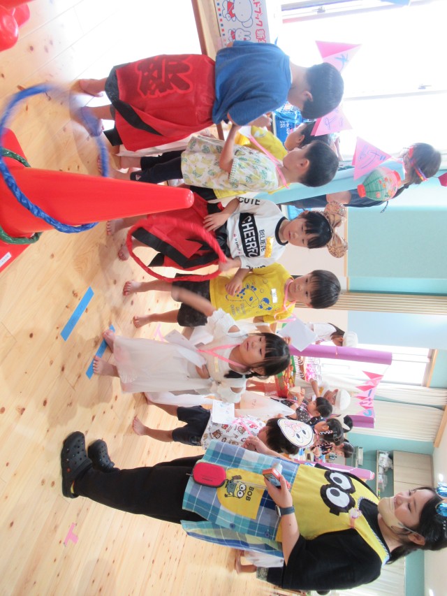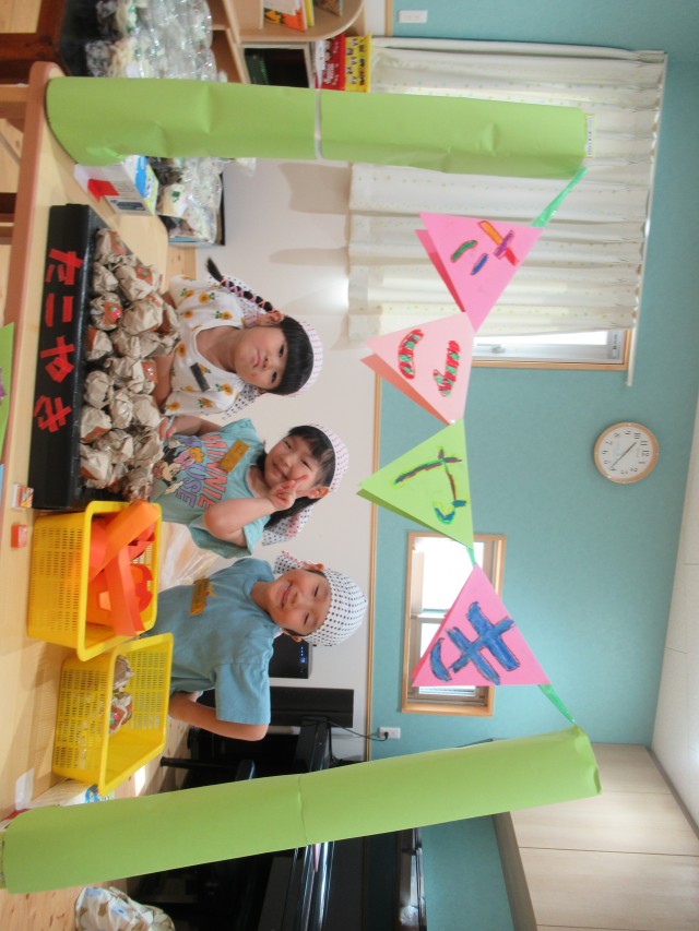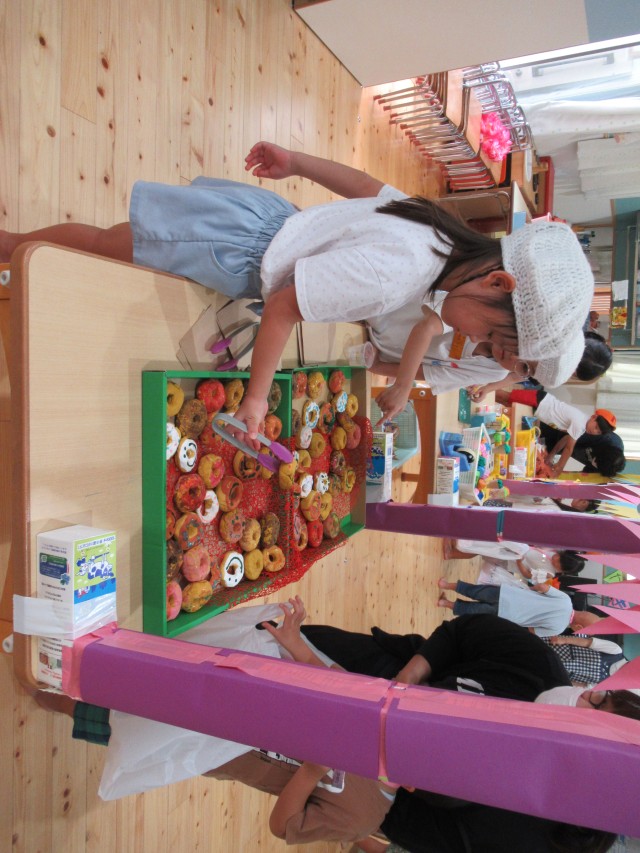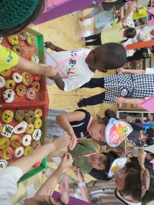 うめ組ともも組が一緒になって計画したお買い物ごっこをしました。ハンバーガーやアイスクリームにアクセサリーは子どもたちがみんなで制作しました。うめ組が店長でもも組がサブリーダー、お客さんは子どもたちでそれぞれお買い物を楽しみました。 | ||