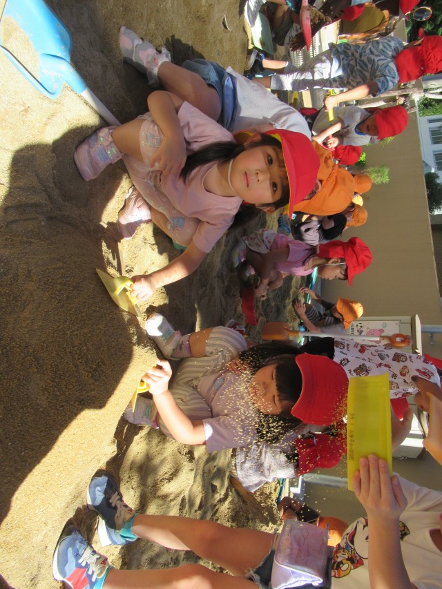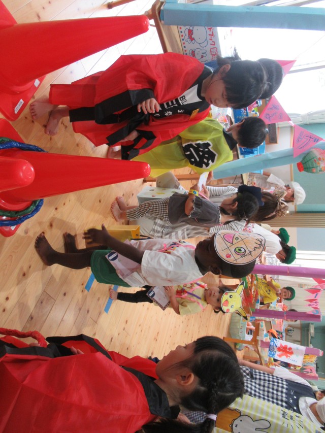 目隠しをして一人ずつ棒を持ち進みます。周りから、「みぎ、ひだり」と声かけられるけどなかなかスイカは割れません。先生たちもchallengeして最後はスイカが割れて美味しく食べました。 | ||