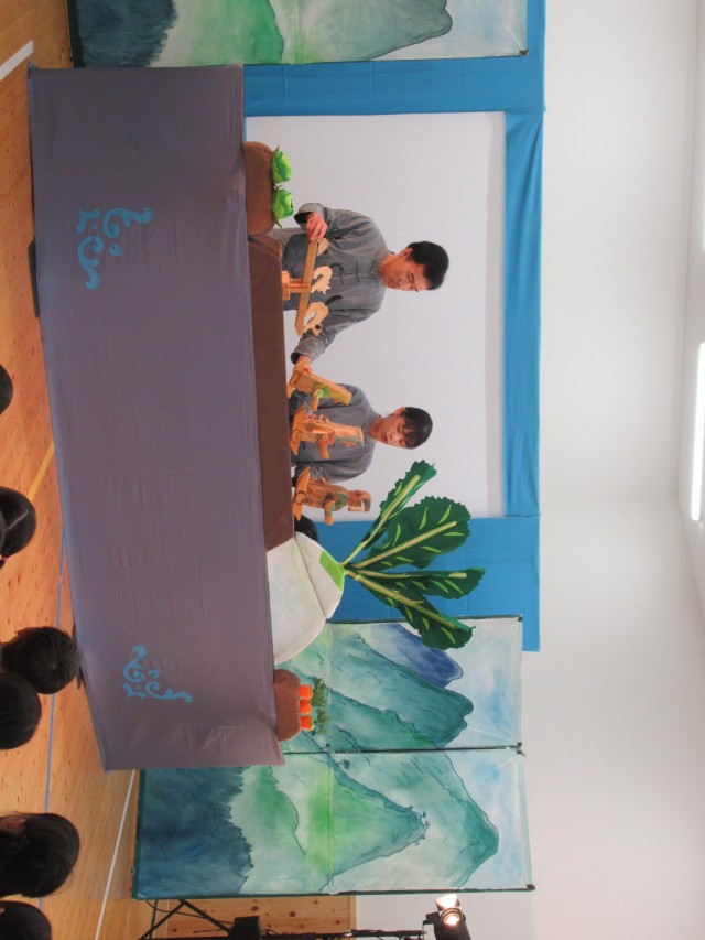 5年ぶりに人形劇が来ました。初めての子どもたちはみんな目がキラキラしながら見ていました。「おおきなカブ」「マーリャの魔法の筆」の二本立てでした。人形の動きに笑ったり、少し怖がったりしていました。本物に出会えて子どもたちの心が豊かになった一瞬でした。 | ||